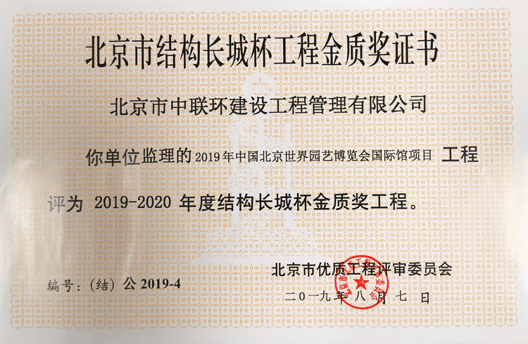 熱烈祝賀公司監(jiān)理的“2019年中國北京世界園藝博覽會國際館項目”和“北京市冰上項目訓(xùn)練基地1標(biāo)段(綜合館)”工程評為2019-2020年度結(jié)構(gòu)長城杯金質(zhì)獎工程。
